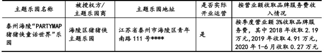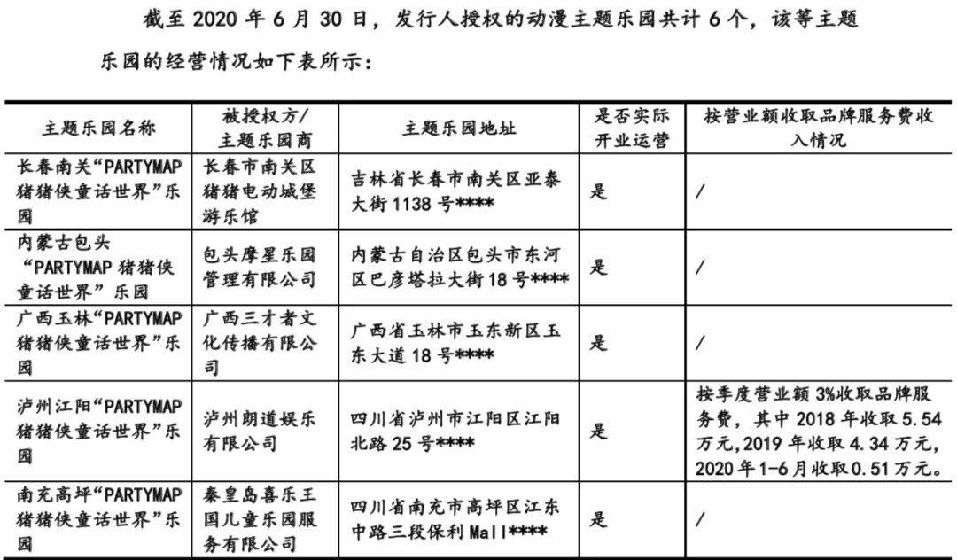 截至2020年6月30日,授权的动漫主题乐园共计6个。其中,品牌服务费的收入按季度营业额的3%收取。2018年,2019年和2020年上半年,向泸州江阳“PARTMAP猪猪侠童话世界”乐园收取品牌服务费5.54万元、4.34万元和0.51万元。