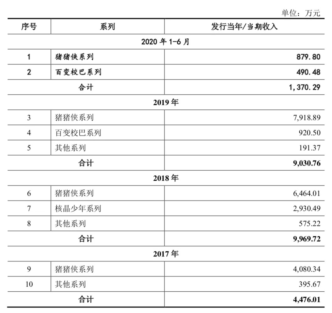 2017-2019年及2020年上半年,猪猪侠系列给咏声动漫贡献的发行收入分别有4080.34万、6464.01万、7918.89万元和879.8万元;百变校巴系列2019年和2020年上半年的发行收入则为920.50万元、490.48万元;核晶少年系列2018年发行收入2930.49万元。