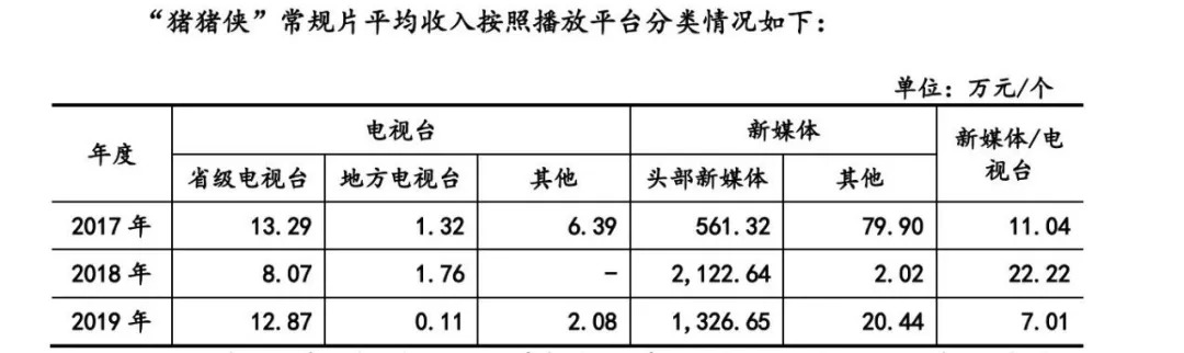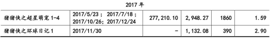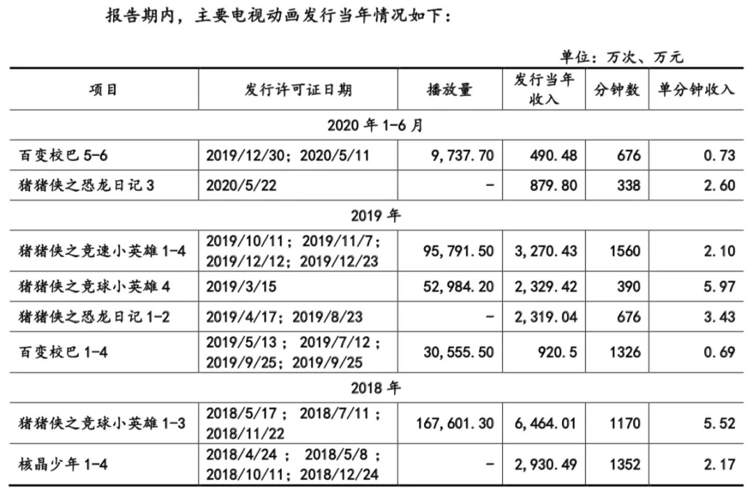 电视动画发行收入方面,“猪猪侠”番外篇的单分钟收入相对较为稳定,2017年《猪猪侠之环球日记》单分钟收入为2.90万元,2019年《猪猪侠之恐龙日记》单分钟收入为3.43万元,2020年1-6月,《猪猪侠之恐龙日记3》单分钟收入为2.60万元。“猪猪侠”常规片的单分钟收入在2018年出现较大幅度的上升,主要是由于新媒体客户提高采购价格导致的,与同行业表现一致。