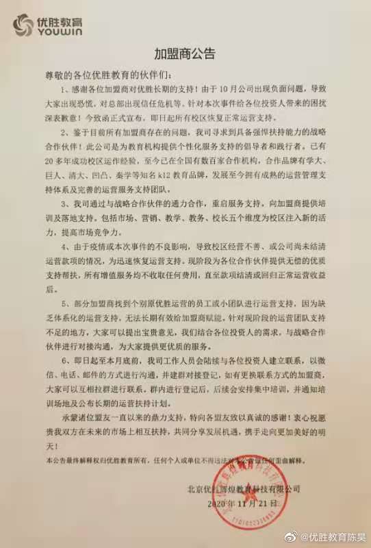 21日晚间,优胜教育CEO陈昊在其个人微博发布加盟商公告称,即日起所有校区恢复正常运营支持,“现阶段为各位合作伙伴提供无偿的优质支持帮扶,所有增值服务均不收取任何费用,直至款项结清或回归正常运营收益后。”