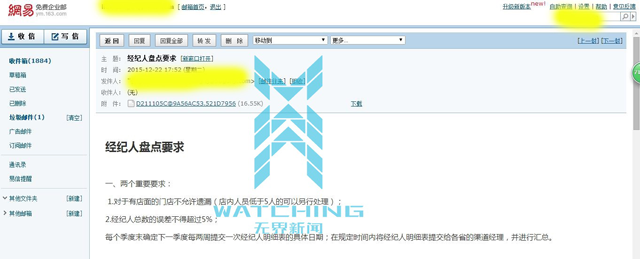 58赶集去年12月22日发给代理商的“经纪人盘点要求”邮件提出:1.对于有店面的门店不允许遗漏;2.经纪人总数的误差不得超过5%;在规定时间内经纪人将明细表提交给各省的渠道经理进行汇总。
