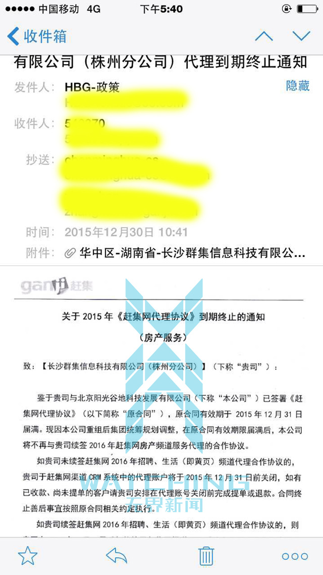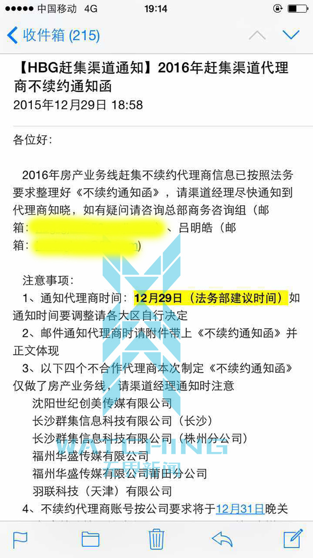 无界新闻记者获取的内部邮件亦显示,去年12月29日,58赶集已下发2016年赶集渠道代理商不续约通知函,法务部建议通知代理商时间为12月29日。但代理商向无界新闻提供的邮件则显示,部分代理商收到邮件时是12月30日。