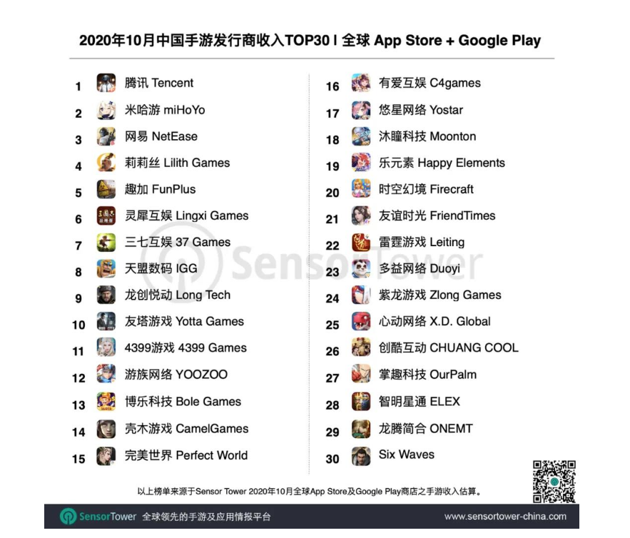因《原神》的惊人表现,米哈游10月收入环比激增567%,坐上2020年10月全球发行商收入榜第二名,仅在腾讯之后。