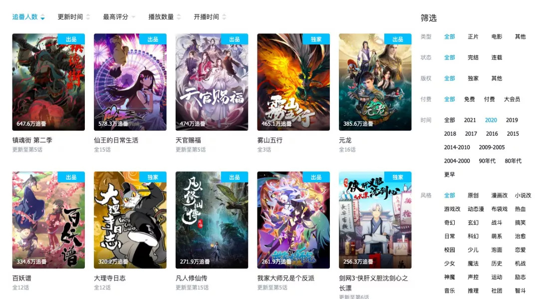 截止目前,2020年B站国创区上线了97部作品(除去部分动画电影)。基于B站浓郁的ACGN氛围与天然的社交发酵能力,这一年B站国创区一连出现了《雾山五行》《天官赐福》等口碑作品。