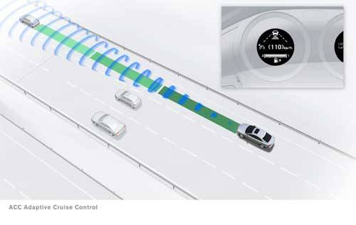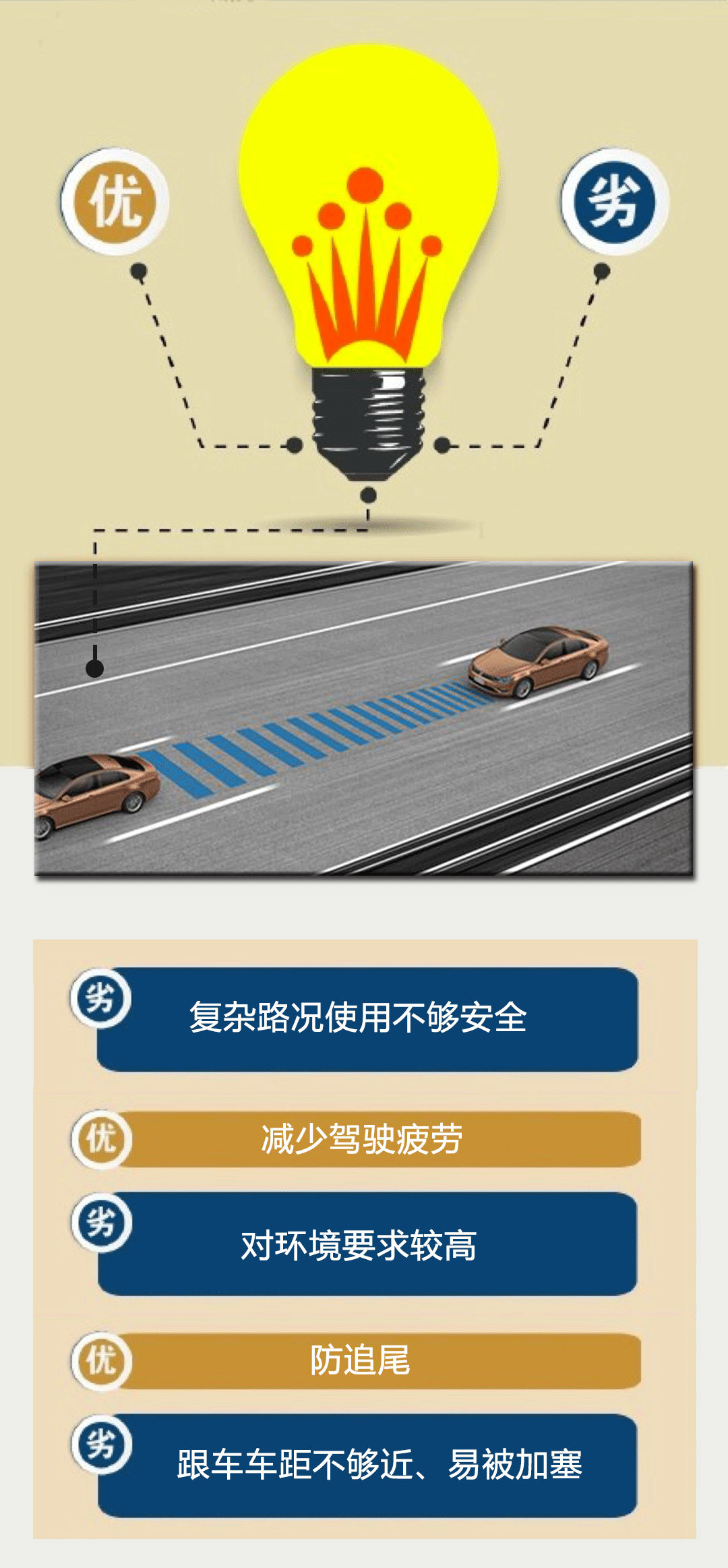 当同一条车道前方没有车辆时,像通常的巡航控制一样按照设定的车速行驶;当前方出现车辆时,以低于设定车速行驶,控制本车与前方车辆的合理间距。四种典型的功能: