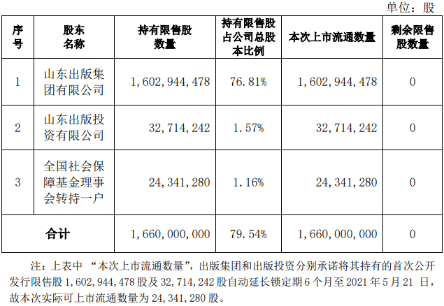 山东出版集团有限公司、山东出版投资有限公司分别承诺将其持有的限售股16.03亿股及3271.42万股自动延长锁定期6个月至2021年5月21日,故本次实际可上市流通数量为2434万股。半年后再关注相关股东的减持意向。