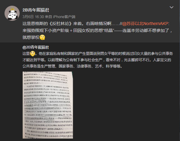 如果说恩格斯的作品虽有一定局限、但仍不失为一部经典的话,为什么在今天的中文网络上,会有人把恩格斯的观点和“田园女权”联系起来呢?