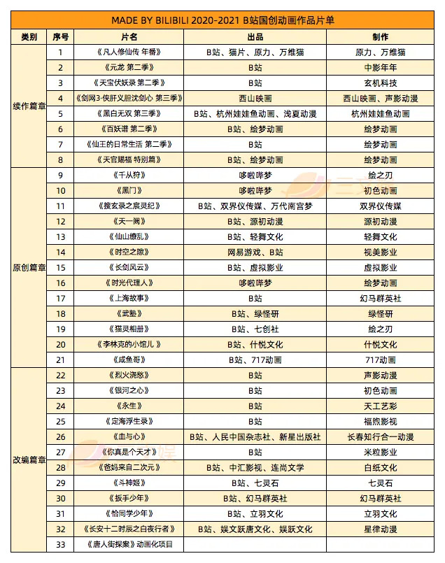 11月21日,B站举办2020-2021国创动画作品发布会,公布了33个动画剧集项目的新进度,还透露B站已经布局了4部国产动画电影。