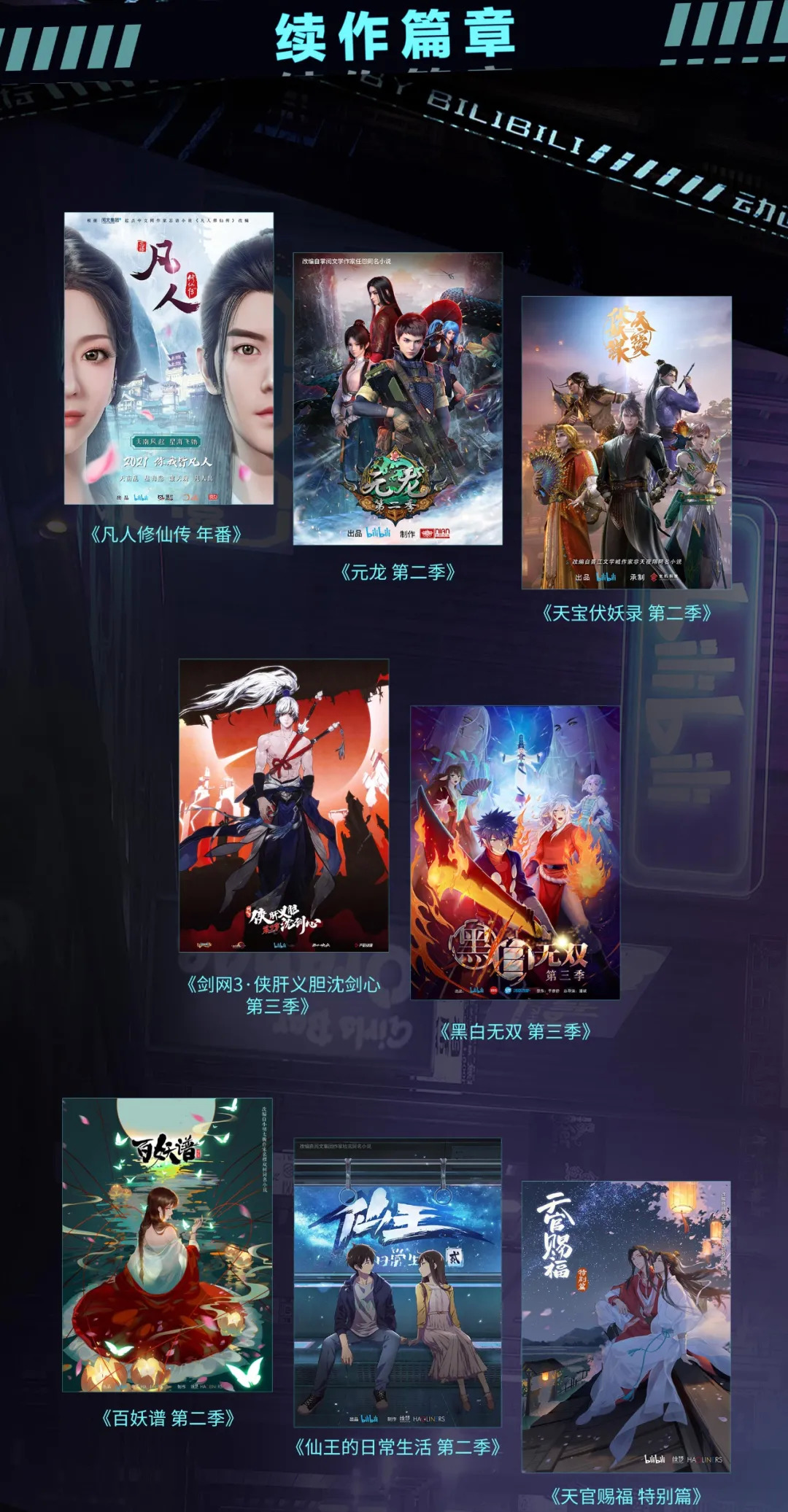 《凡人修仙传 年番》《元龙 第二季》《天宝伏妖录 第二季》《剑网3·侠肝义胆沈剑心 第三季》《黑白无双 第三季》《百妖谱 第二季》 《仙王的日常生活 第二季》《天官赐福 特别篇》。