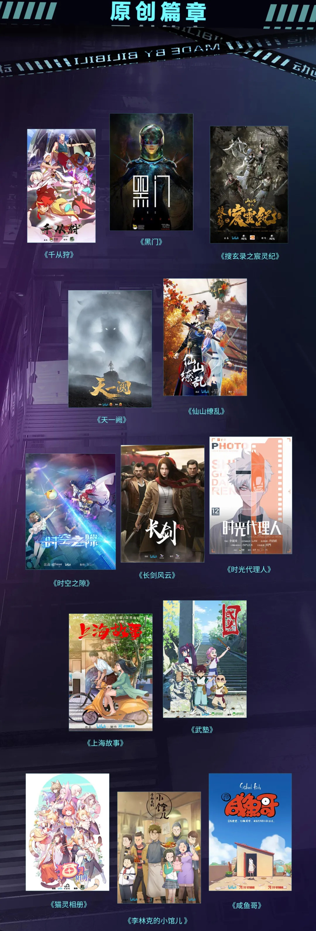 这些原创项目中,有B站与绘梦动画联合成立的哆啦哔梦首次亮相的三部作品《千从狩》《黑门》和《时光代理人》;有的项目来自B站用于扶持原创动画人的活动“小宇宙新星计划”,比如去年获得小宇宙计划银奖的工作室717动画工作室,联合B站出品原创动画《咸鱼哥》。