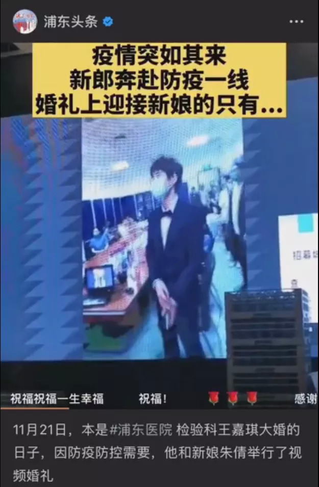 在出现一例确诊病例的浦东医院,院方紧急暂停日常门急诊医疗服务,继续做好在院患者医疗救治的同时,对医院进行封闭式管理,4015名在院员工、患者和陪护人员全部隔离观察,并进行全员核酸检测。11月21日,本是浦东医院检验科医生王嘉琪结婚的日子,因为防疫需要,他和新娘朱倩只能举行视频婚礼。婚宴上,只有新娘一个人的身影,镜头那边,是穿着西装戴着口罩的新郎。这动人的一幕,令网友们纷纷送上祝福:你们的婚礼很特别,值得一生铭记!