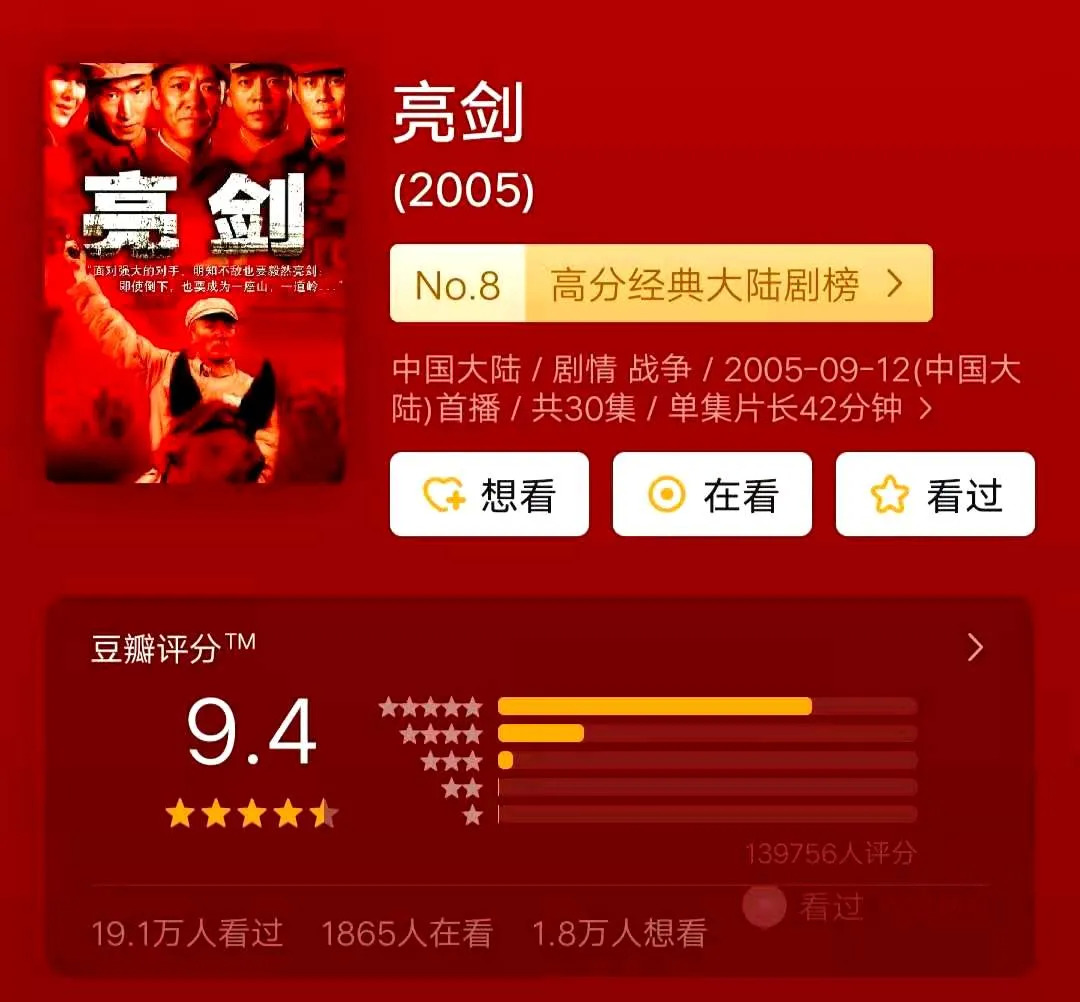 2005年《亮剑》一经播出就创下了收视神话,平均收视率达到11.42,最高13.7,份额28.7。不仅如此,这个“神话”经久不衰,五年后累计重播已累积重播已达3000次,十年后《亮剑》偶尔还能进收视榜的前五。在剧迷心中,《亮剑》更是常年霸占抗日剧榜首,豆瓣上有19.2万人看过,近14万人给其打分,豆瓣评分保持在9.4。可以说,作为经典,《亮剑》创造了第一个抗日“神剧”,而这个“神”却和如今的抗日神剧截然不同。
