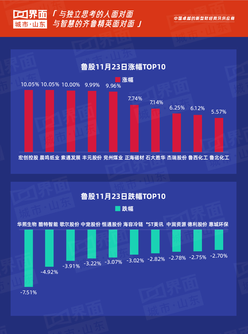 受大盘影响,11月23日,山东省内沪深股票有123只个股上涨,89只个股下跌, 宏创控股涨幅最高达10.05%。