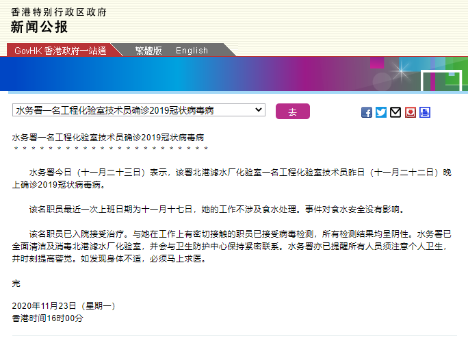 11月23日,香港特区政府发布新闻公报称,水务署今日表示,该署北港滤水厂化验室一名工程化验室技术员昨日(22日)晚上确诊新冠肺炎。该职员最近一次上班日期为11月17日,她的工作不涉及食水处理。此事件对食水安全没有影响。