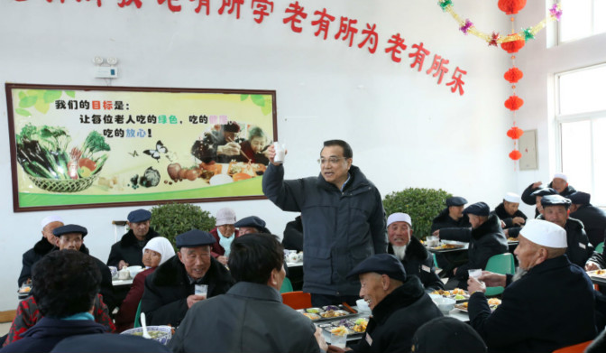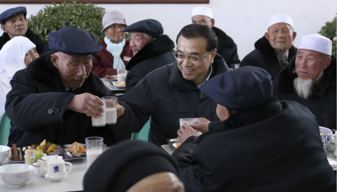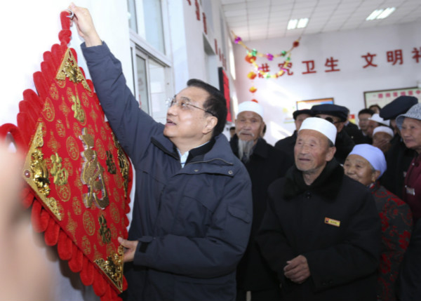 李克强1日来到宁夏固原市原州区中心敬老院,与老人们在一起过小年。总理与坐在身旁的回族老人马安仓边吃边拉家常,称赞老人“红光满面”,还给他盛了一碗热气腾腾的饺子。随后,李克强起身举起手中的热饮,祝愿各位老人身体健康,幸福长寿。