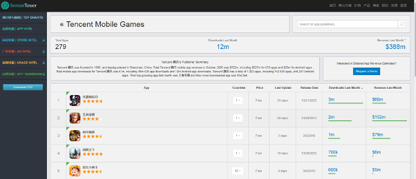 《王者荣耀》发布者“Tencent Mobile Games”下面有279个APP(去掉个别 “腾讯地图”“QQ读书”等工具类app,游戏依旧占据绝大多数),在279个app能被用户知晓的又有几个?在过去一个月里,其中有超过200个app下载次数不到一万,近184个下载次数不到5000。