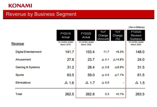 陆陆续续流失了多位优秀的游戏制作人,但是他们依然在赚钱。因为Konami并不是一家纯游戏公司,游戏业务只是它的一部分。从Konami 公布的2020财报来看,Konami “数码娱乐产业” 的营收依旧占据了总营收的58.37%,毕竟Konami还有《实况足球》《实况力量棒球》《游戏王》等游戏产品。