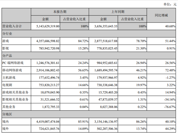 从完美世界2020年半年度财报可以看出,游戏依旧占据营收的主要比重,占据84.72%,同比增幅51.44%,影视也贡献了15.28%的营收比重,与往期相比变化不大。