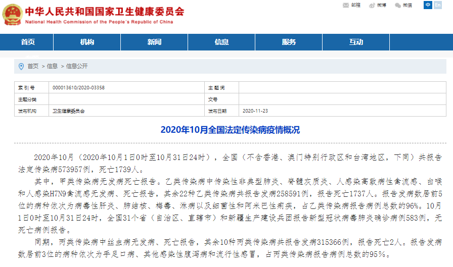11月23日,国家卫健委网站通报称,2020年10月(2020年10月1日0时至10月31日24时),全国(不含香港、澳门特别行政区和台湾地区,下同)共报告法定传染病573957例,死亡1739人。