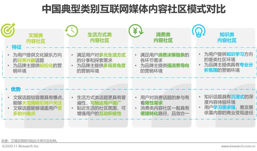 其中,文娱类、消费类、生活方式类和知识类是当前较为典型的互联网媒体内容社区类型,各类别的内容社区具有着各自的差异化优势,为品牌主和用户带来特有价值。