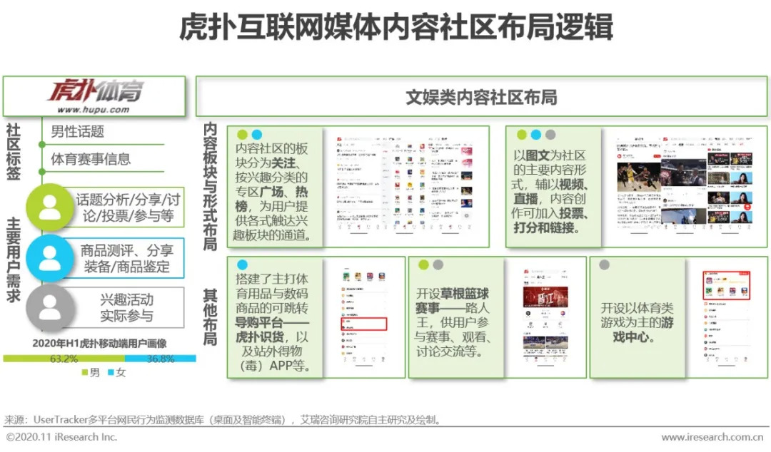 虎扑用户以男性为主,用户对讨论体育话题等具有强需求。因此,虎扑围绕男性用户特征和兴趣方向搭建内容社区,从用户关注的专区/用户、按兴趣分类的专区广场、以及基于热度算法推荐的热榜来共同为用户以主动被动等方式供应内容。其中,广场内容板块由以体育兴趣专区为主体的局面逐步向契合用户各方兴趣的体育、数码、汽车、游戏等多元局面扩展。因男性对数据具象化、竞技模式等的偏好,在发布内容时,用户可以在内容中添加投票、打分模块来评价或比较事物。为保证用户在社区中衍生出的消费、实际参与等行为链条能够完整化,虎扑开设了用户可以亲自参与的篮球赛和游戏中心,并搭建了可由主站跳转的商品导购平台和淘宝店铺,以及针对潮流人群的站外商品交易与鉴别平台——得物(毒)APP 。