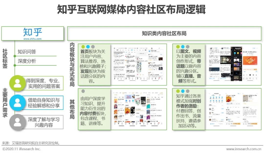 为满足平台用户对于感兴趣领域中的问题回答和内容的专业度和深度要求,以及对用户内容分享的便利性,知乎在内容板块方向布局了问答和文章推荐板块、兴趣圈子、话题频道等,用户可根据话题和兴趣方向找寻到所需要或感兴趣的内容。同时,图文、视频、直播、音频等内容形式的布局,则让内容分享的展现方式更为灵活。由于优质的回答和文章内容是知乎内容社区与用户的重要链接,因此除为用户提供多元内容体验外,不断激励社区创作者进行内容创作、提升内容创作质量成为知乎内容社区布局的重要方向。知乎将优秀答主的回答转为付费咨询,邀请创作者写文章,开Live讲座并将之列入内容付费,打造IP,为其提供流量支持等等,使得优质的创作者和内容能以更好的形式出现在具有相关需求的用户眼前。