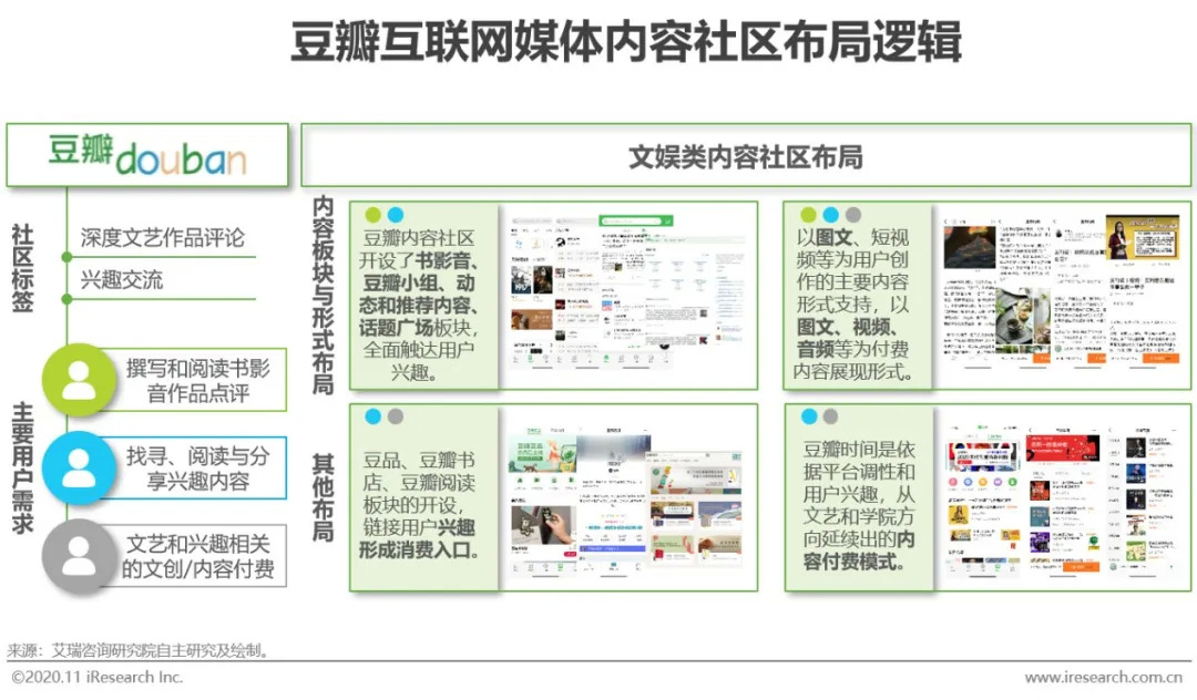 豆瓣用户具有强自主性和强文艺特征,也促使平台内容社区重点围绕着实现用户的内容寻找与分享需求而布局。豆瓣内容社区的内容板块布局赋予了用户更大的主动性和探索性,用户可通过自己的兴趣方向在豆瓣小组、话题、书影音等板块中去深度探索喜欢的小组、话题和书影音作品等;话题、内容、小组等板块间的联通又使用户使用内容的整体性加强。同时,为使新加入社区的用户能够快速找到契合自己兴趣点的内容,豆瓣也增加了比小组探索深度和难度更为轻量级的话题板块。在内容社区的衍生板块方向,1)豆瓣书店和豆瓣阅读、与视频平台共通的影视跳转链接、展览活动等的购票途径为用户提供了书籍、影视、兴趣活动内容交流后的转化渠道;2)学者向和文艺向的内容付费则配合了用户的内容需求升级。