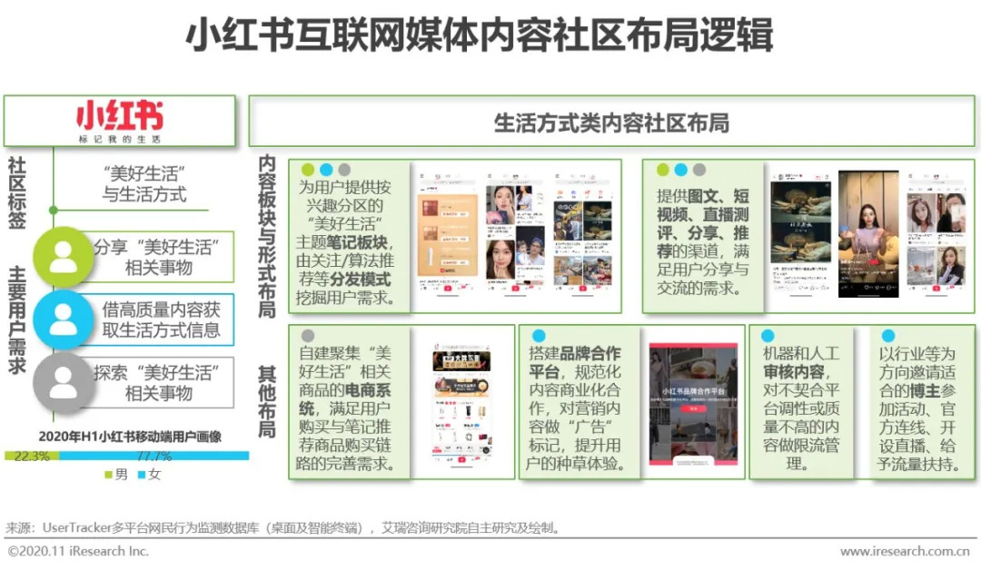 小红书平台的用户以年轻女性为主体,社区内容版块围绕包含美妆、衣着、美食、情感、音乐、摄影、旅行、健身等多元生活方式在内的“美好生活”主旨而搭建与强化。小红书平台内容社区用户的需求集中在对生活方式的分享、探索以及相关信息的获取上,为满足用户需求,小红书平台开设话题和地点链接,搭建商城,布局图文、短视频和直播内容形式,按兴趣板块分类笔记等,不断满足用户对生活方式内容的需求、完善用户对“美好生活”相关事物的探索链路。同时,小红书通过搭建品牌合作平台、加强内容审核和流量限制管理、激励扶持挖掘博主、严审商城入驻品资质等,进一步保证了平台内容的质量和生产量以及用户的内容体验等。