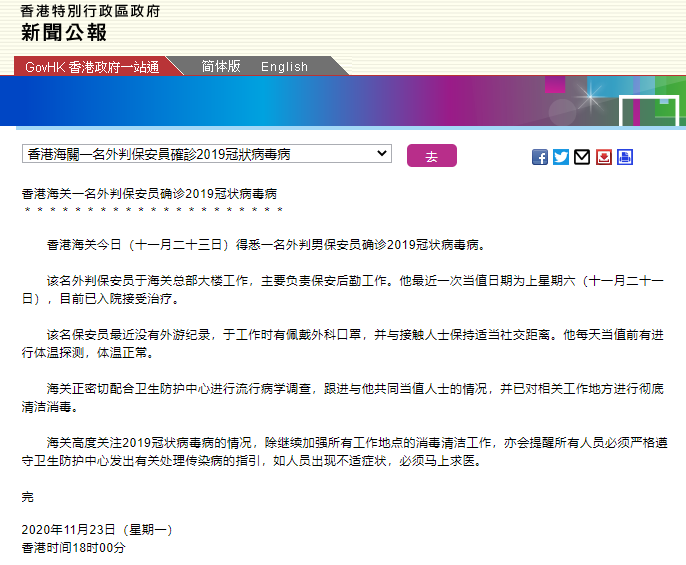 通报称,此外判保安员于海关总部大楼工作,主要负责保安后勤工作。他最近一次当值日期为上星期六(11月21日),目前已入院接受治疗。他最近没有外游纪录,工作时有佩戴外科口罩,并与接触人士保持适当社交距离。他每天当值前有进行体温探测,体温正常。