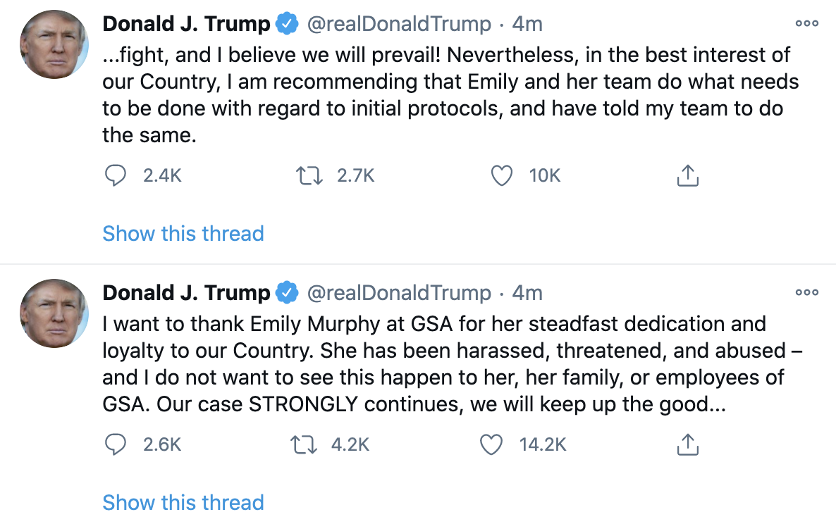 当地时间23日,现任美国总统、共和党总统候选人特朗普在推特上发文称,建议美国联邦总务署(GSA)署长艾米丽·墨菲(Emily Murphy)及其团队根据最初的协议做需要做的事,并且已告诉自己的团队要这样做。