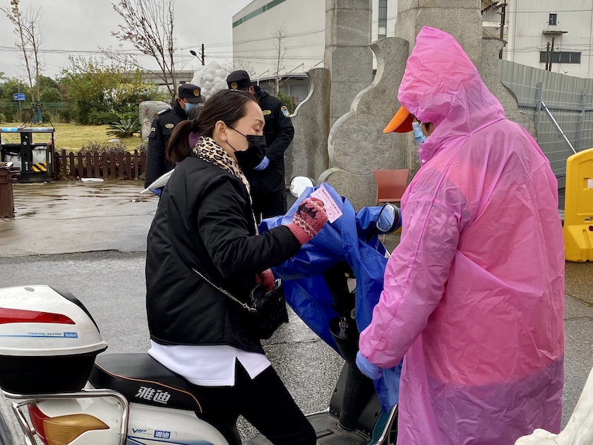 有一位村民没带身份证,只有出入证,志愿者提示她之后要带身份证,务必人证能对上。“因为出入证没有照片,要防止有人用别人的出入证。”志愿者解释。