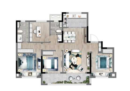 餐客厅:东芝中央空调、法国爱迪士/美国百朗品牌新风系统、博世地暖,客厅实木多层复合地板,墙纸交付。