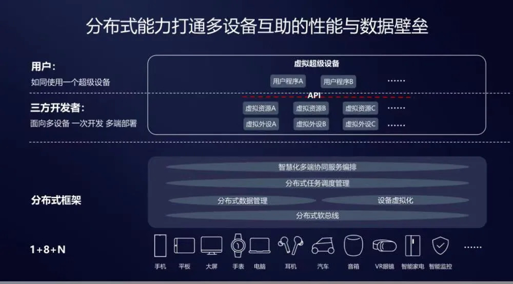 通过发布鸿蒙 OS,提出分布式系统路线,华为正凭借过硬的通信技术弯道超车。鸿蒙分布式技术,就是把各种硬件能力切割为字模,自由重组,形成新的超级终端。与此同时,华为也开放了分布式能力的SDK,让第三方的软件和硬件都可以快速与华为终端设备建立连接并调用相应的能力。