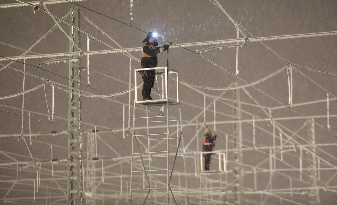 铁路线一般在夜间对接触网进行维护,这期间会停电,如果碰上雨雪天气更容易覆冰。翁尔朋称,要根据天气预报和实际状况,要尽可能确保接触网处于带电状态,电流通过电线产生的热量可以减少覆冰。