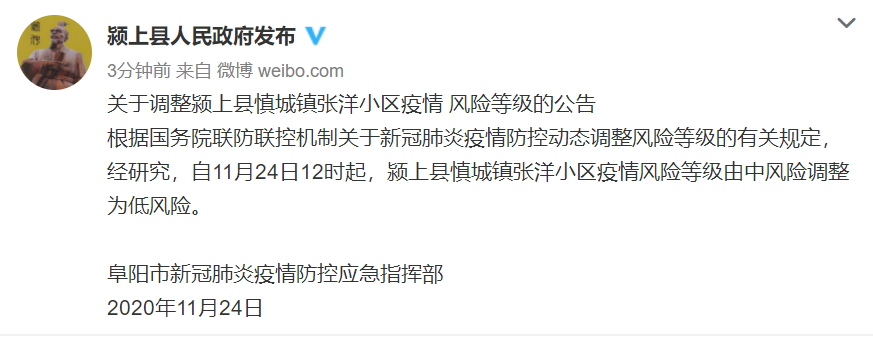 据@颍上县人民政府发布 微博消息,根据国务院联防联控机制关于新冠肺炎疫情防控动态调整风险等级的有关规定,经研究,自11月24日12时起,颍上县慎城镇张洋小区疫情风险等级由中风险调整为低风险。