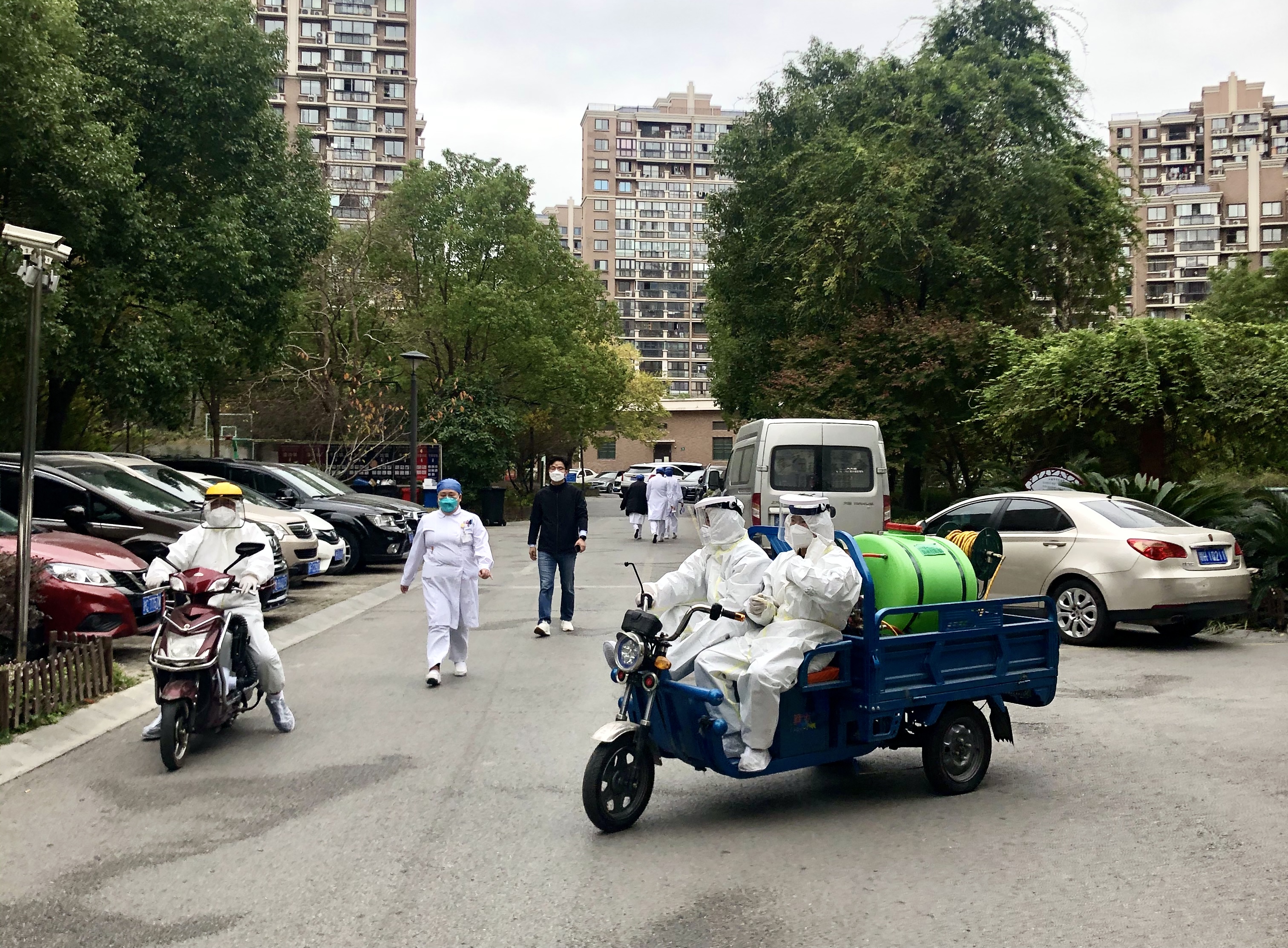 11月24日是罗钰隔离在家的第四天,她告诉界面新闻,早上从窗户望下去,能看到防疫人员穿着防护服在每个楼道口进行消毒,在电梯间也能闻到一股消毒液的味道。