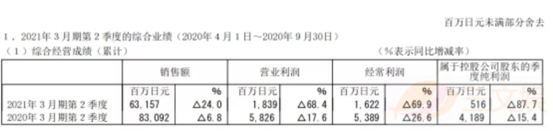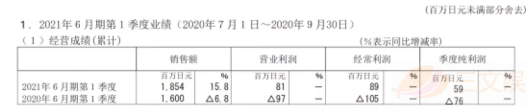 在利润方面总营业利润仅为18亿3900万日元,同比下降68.4%,经常利润为16亿2200万日元,同比减少69.9%。