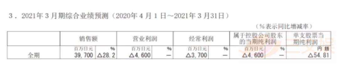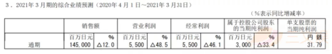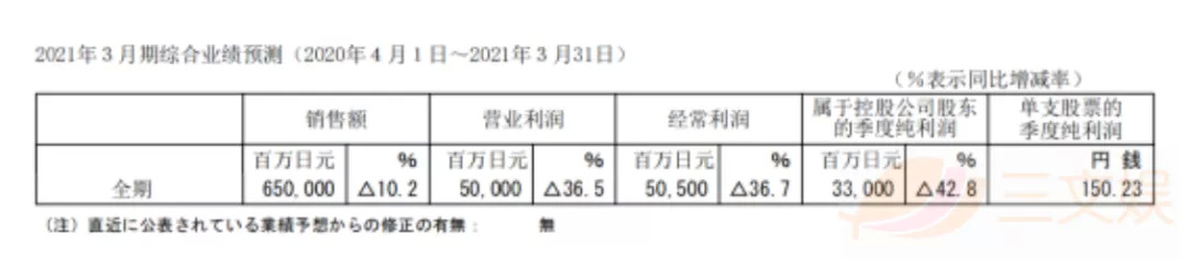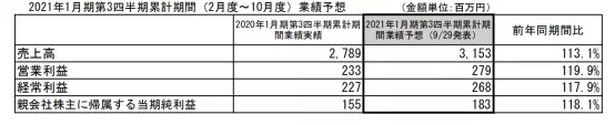 和2020年9月29日发表的2021财年1月期第3季度(2月度—10月度)的各项财务预测值相比,实际的销售额、营业利润、经常利润和属于控股公司股东的季度纯利润都没有超过预测值,但与去年同期相比均增长。