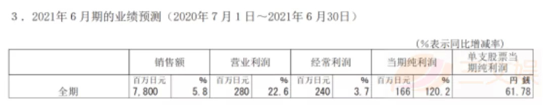 财报中,寿屋也对2021年6月期(2020.7.1-2021.6.30)财务数据做了预测——销售额为78亿日元,同比增长5.8%;营业利润为2亿8000万日元,同比增长22.6%;经常利润为2亿4000万日元,同比增长3.7%;当期纯利润为1亿6600万日元,同比增长120.2%。