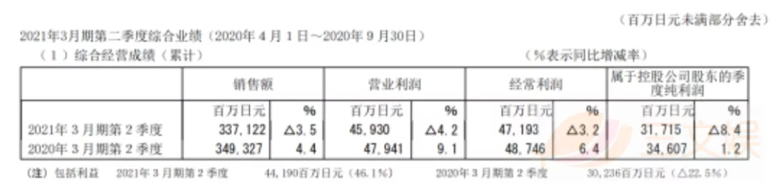 上半年的经营成绩为3371亿2200万日元,同比减少3.5%;营业利润为459亿3000万日元,同比减少4.2%;经常利润为471亿9300万日元,同比减少3.2%;属于控股公司股东的季度纯利润为317亿1500万日元,同比减少8.4%。