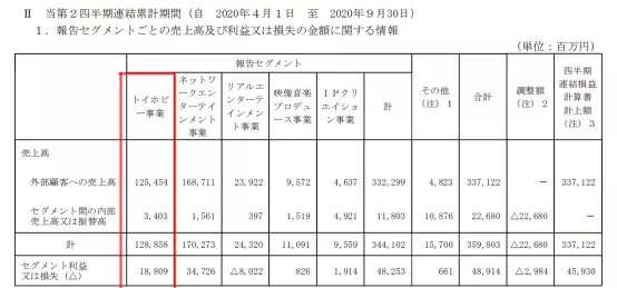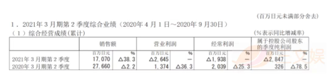 2020年11月6日,万代对外公布了2021财年上半年(2020.4.1-2020.9.30)的财务数据。其综合经营成绩如下:
