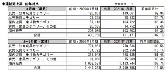 2020年10月19日,婴幼儿玩具制造商People株式会社公布了2021财年第9月度(2020.8.21-2020.9.20)决算数据。