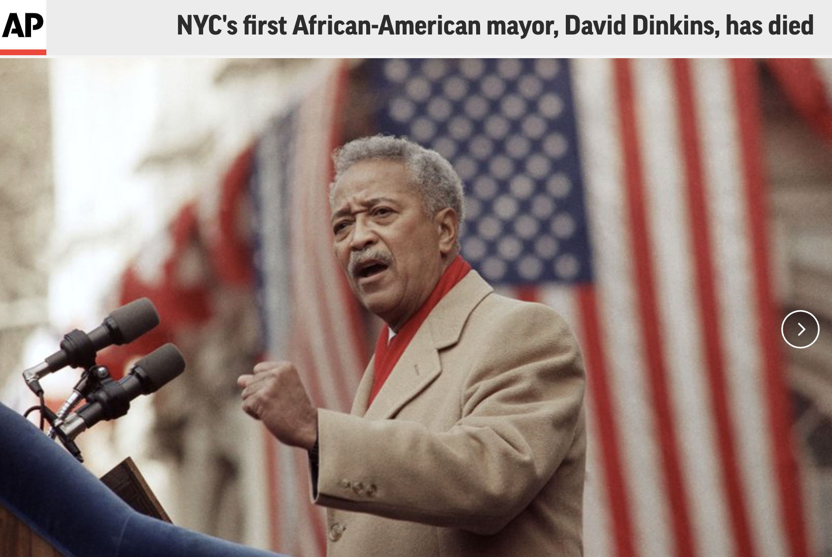 美联社11月24日消息,纽约市警察局证实,纽约首位黑人市长戴维·丁金斯(David Dinkins)23日去世,享年93岁。