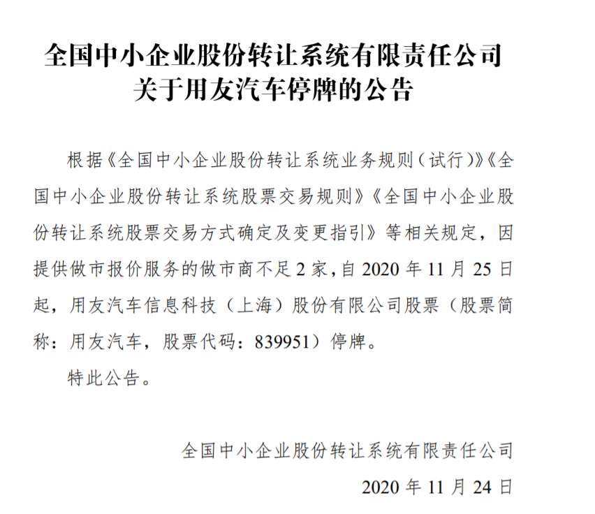 全国中小企业股份转让系统有限责任公司24日发布公告称,根据《全国中小企业股份转让系统业务规则(试行)》《全国中小企业股份转让系统股票交易规则》《全国中小企业股份转让系统股票交易方式确定及变更指引》等相关规定,因提供做市报价服务的做市商不足2家,自2020年11月25日起,用友汽车信息科技(上海)股份有限公司股票停牌。