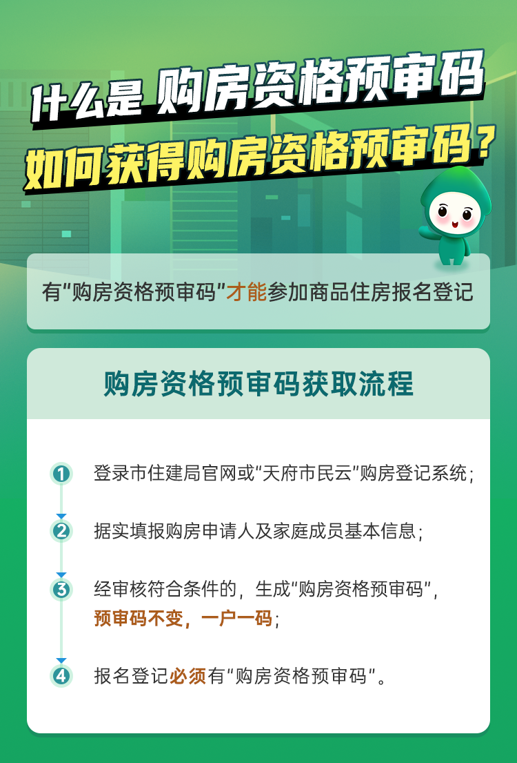 购房资格预审将提前为居民提供资格预审服务,方便居民及时掌握自身购房资格状况、知悉可选购住房的区域,购房人可通过成都市住建局网上政务大厅或者“天府市民云”手机应用客户端登录成都市商品住房购房登记系统(以下简称购房登记系统),据实填报相关信息,申请购房资格预审。经预审符合购房条件的,购房登记系统赋予“购房资格预审码”。