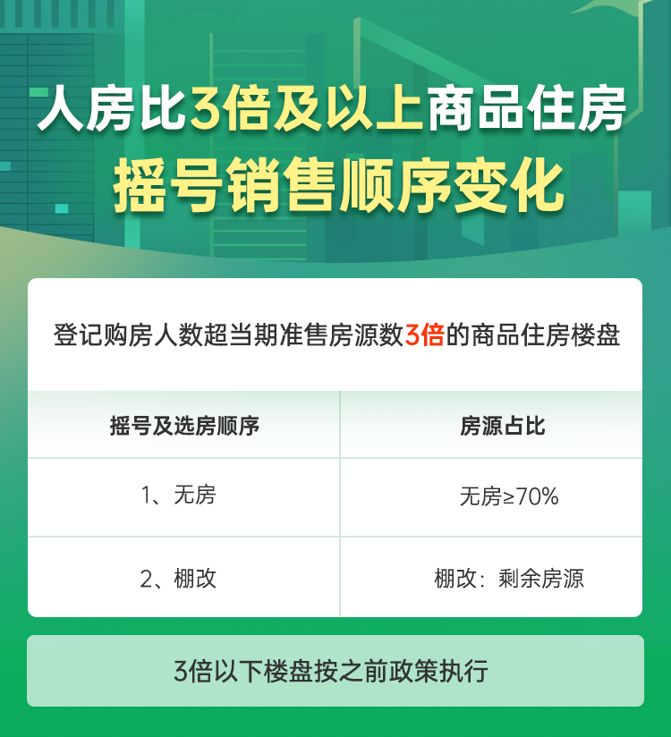 说明:当比例达到3倍以上时,全部房源向已报名的无房家庭和棚改家庭公开摇号选房,其中无房家庭房源数不低于70%,剩余房源将用于棚改住户选购。