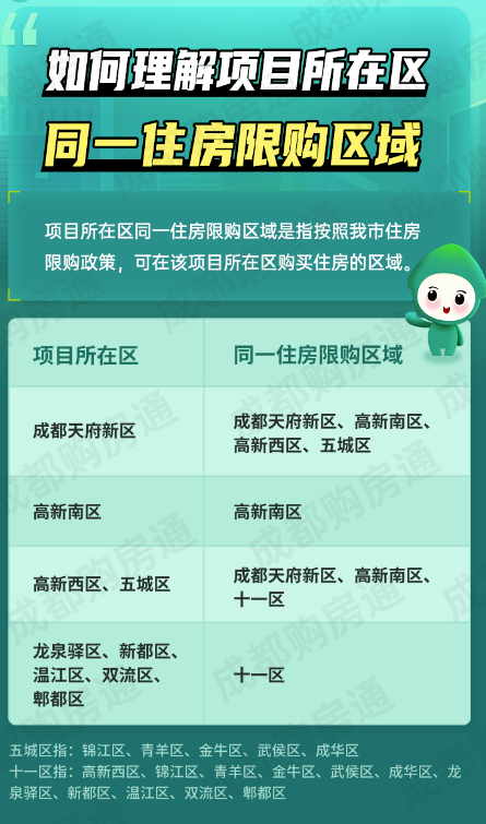 成都天府新区、成都高新区、锦江区、青羊区、金牛区、武侯区、成华区、龙泉驿区、新都区、温江区、双流区、郫都区新建商品住房项目按《通知》相关规定执行。青白江区、郊区(市)县范围内的商品住房销售工作,可参照《通知》执行。