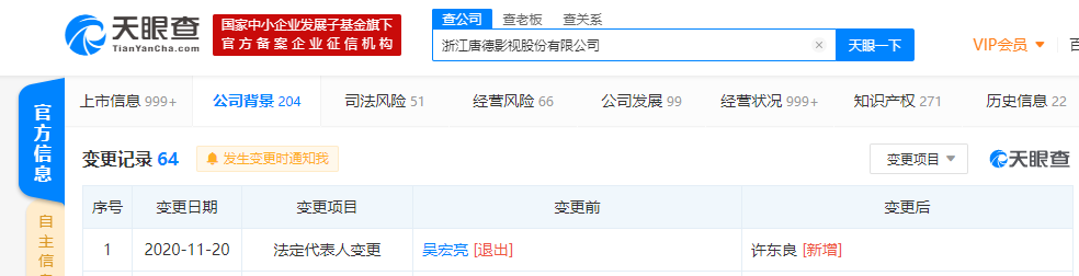 据天眼查APP显示,11月20日,浙江唐德影视股份有限公司发生工商变更,法定代表人由吴宏亮变更为许东良。