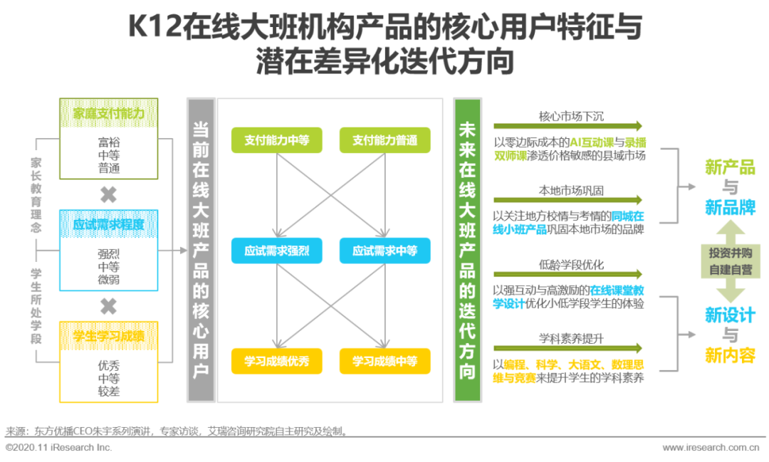 此外,当前的K12在线大班产品依然是适合于具备较强的自主学习能力与自我控制能力的学生,这类学生的学习成绩大多处于中等偏上水平,但往往因为缺乏系统性的解题技巧而导致考试成绩不佳,经常出现“听得懂”、“学得会”、“考得差”的情况。根据上述三个维度的分析结论,艾瑞认为,从盘活存量用户的增量需求与探索增量市场的角度来看,K12在线大班产品存在四类潜在的差异化迭代方向,即新产品、新品牌、新设计与新内容。