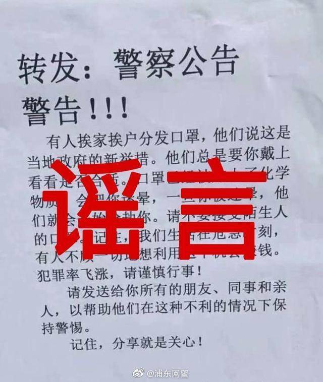 据@中国互联网联合辟谣平台 消息,近日,多地流传一则“警察公告”,声称挨家挨户分发口罩是当地政府的新举措,口罩已经被加上化学物质,将人迷晕后,趁机实施抢劫……经核查,这类谣言此前就在网上流传,山东、广西、河南、江苏、安徽、西藏等地官方已多次辟谣。警方再次提醒,网络不是法外之地,切勿轻信、转发未经核实的信息,保持理性心态,不信谣不传谣。